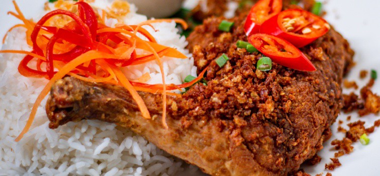 Unique fried chicken served with white rice, ulam & sambal.